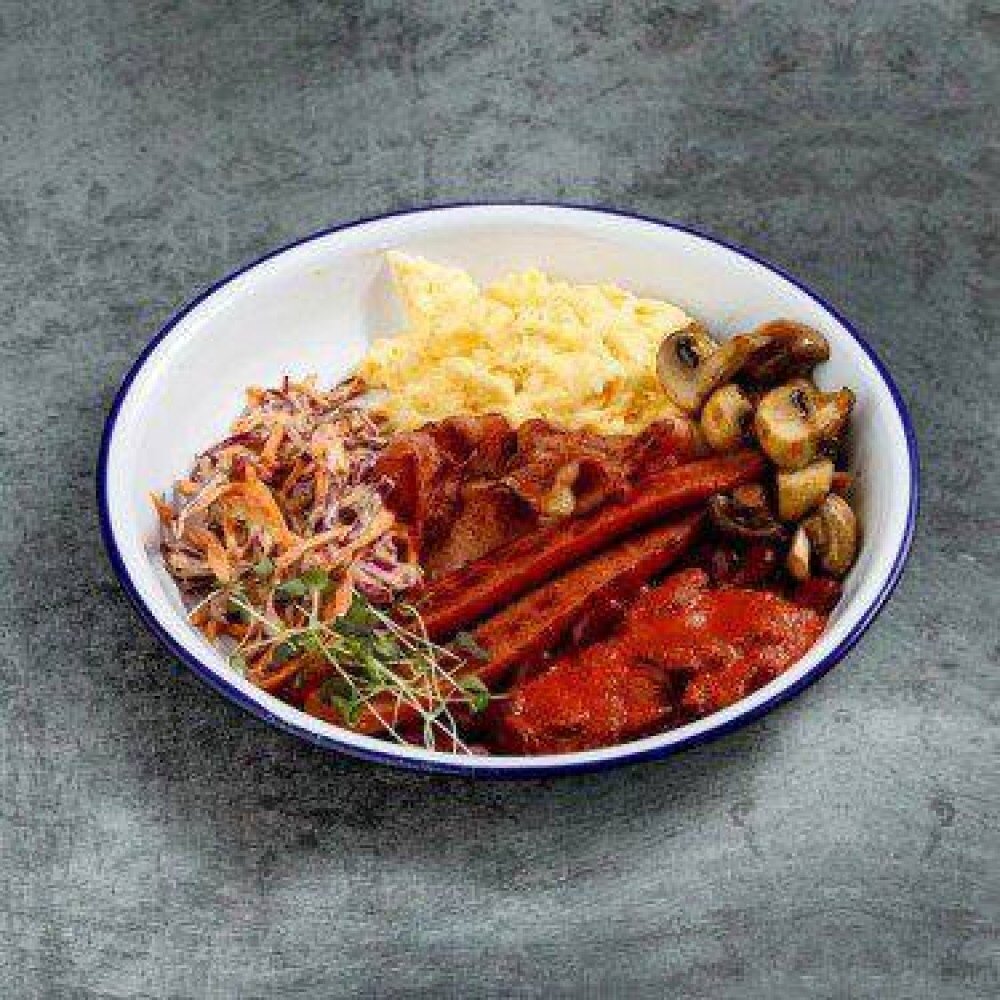 Английский завтрак состоит из скребла, бекона, фасоли, колбаски, фасоли, салата из зелени с томатами и шампиньонов390г