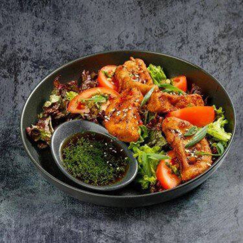 Фирменные баклажаны с хрустящей корочкой, которые подаются со свежей зеленью, сочными томатами и пикантным соусом 517г.
