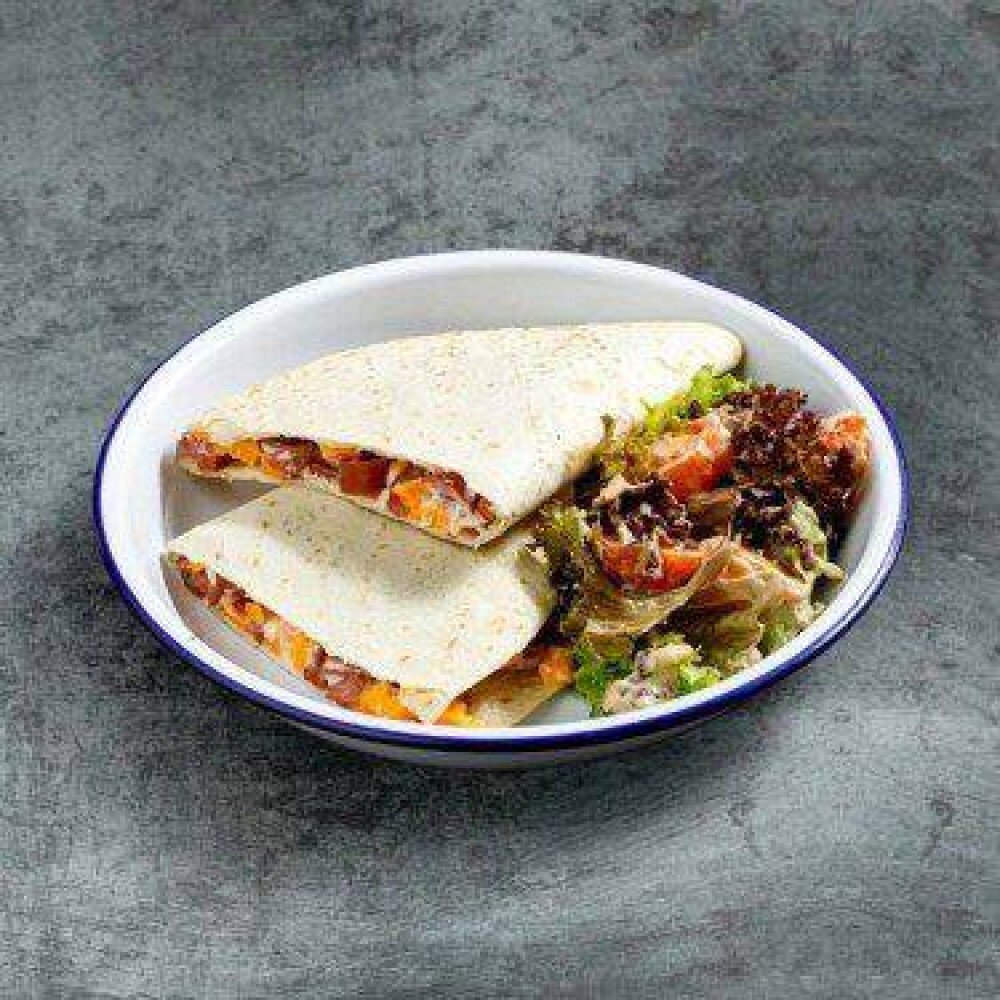 Курица с сыром в тортилье, подается с салатом из хрустящей зелени и томатов280г