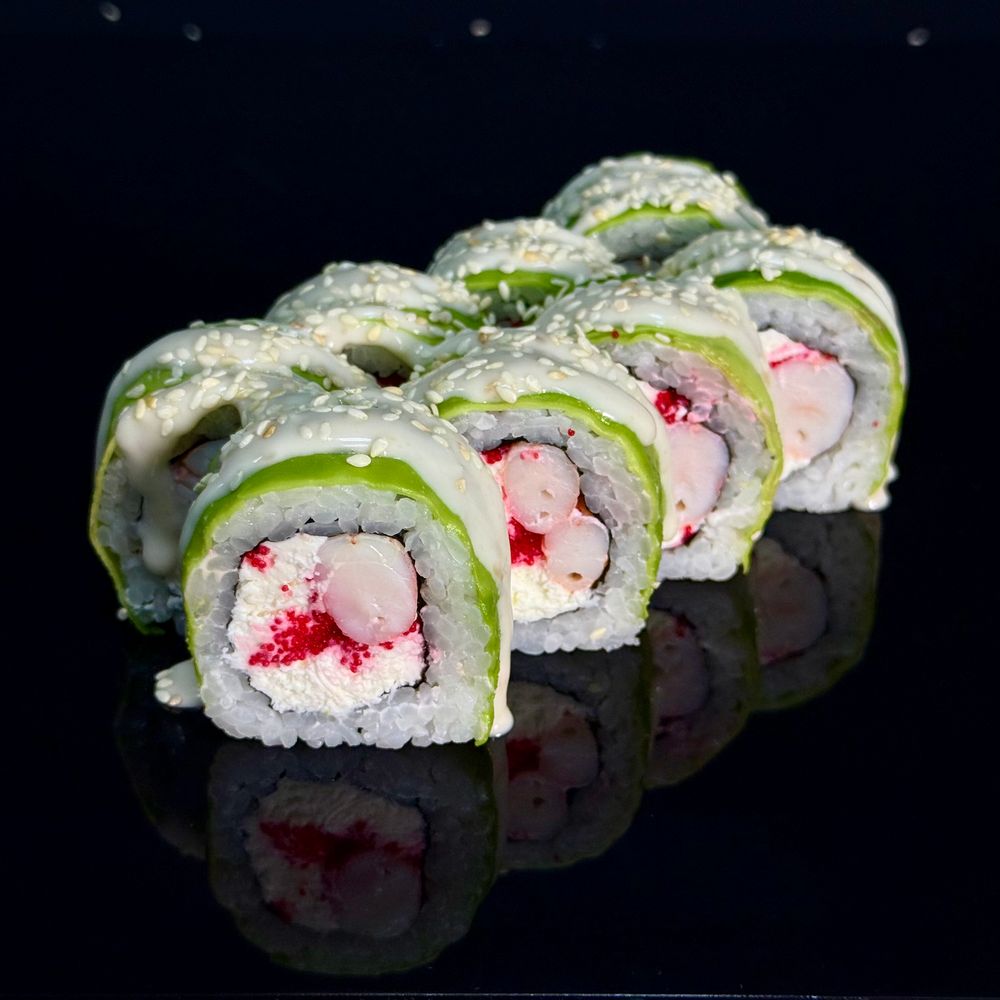 сыр сливочный, икра масаго, креветка, авокадо, ореховый соус, кунжут белый310 гр.