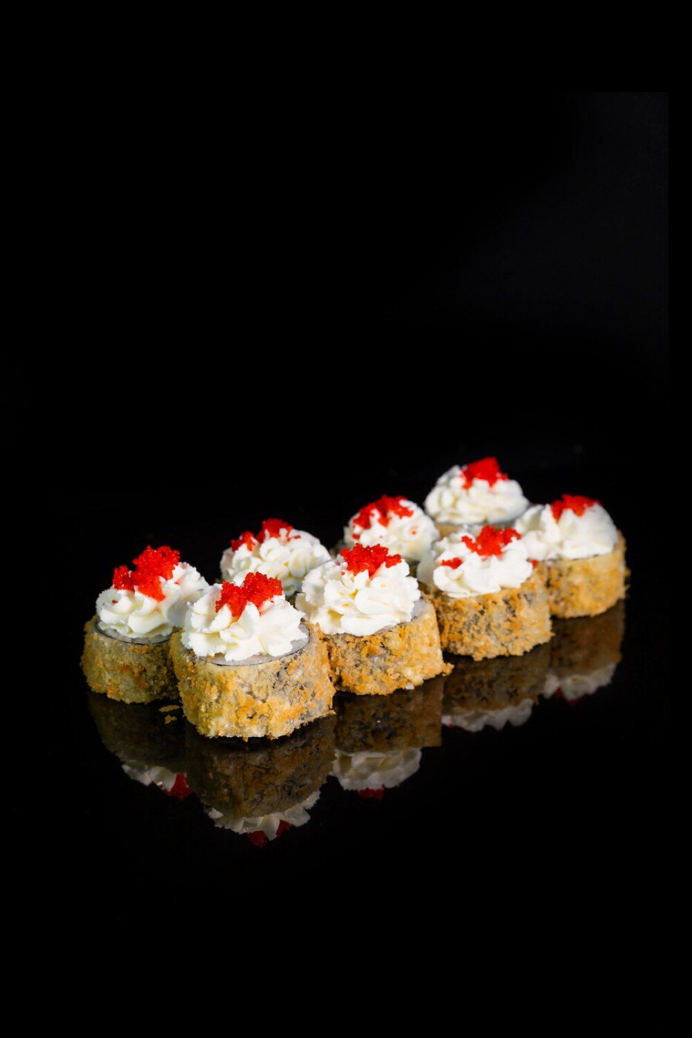 огурец, японский омлет, лосось, сыр сливочный, икра масаго, сухари панко, кляр