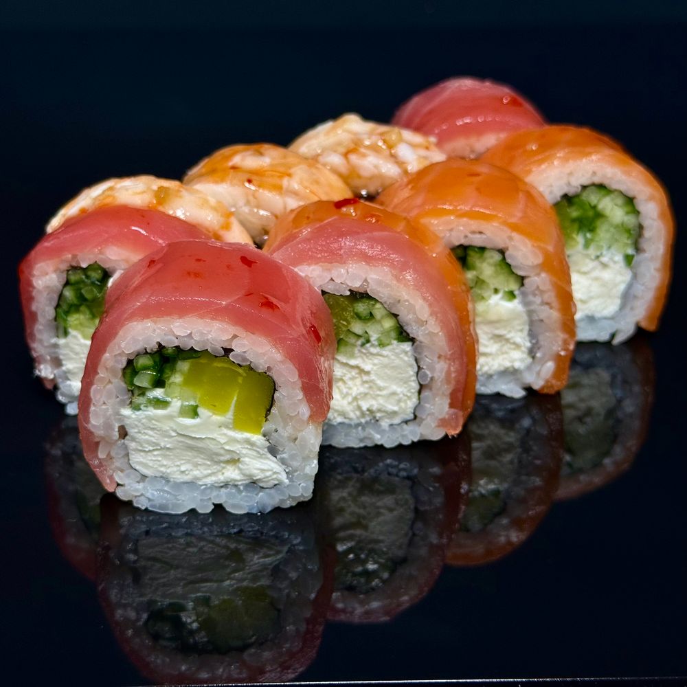 сыр сливочный, огурец, маринованный дайкон, лосось, тунец, креветка, соус свит чили310 гр.