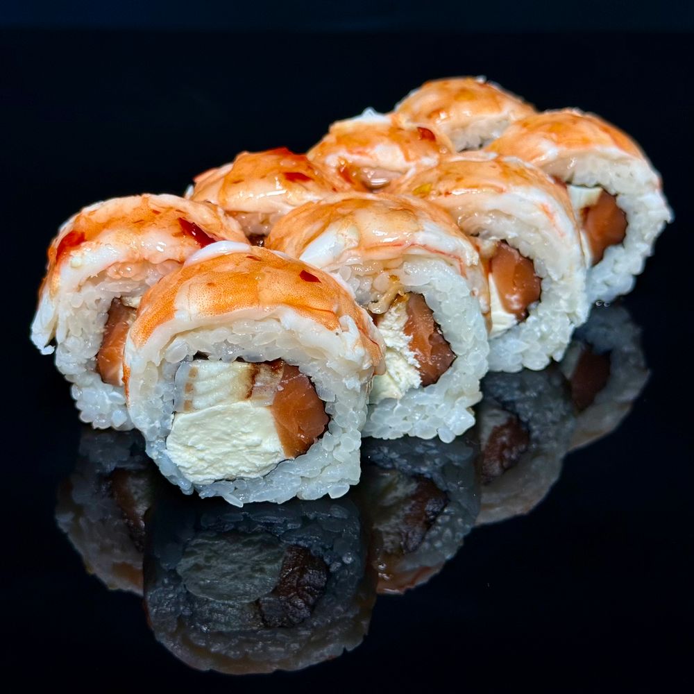 сливочный сыр, жаренный угорь, лосось атлантический, тигровая креветка, соус свит-чили345 гр.