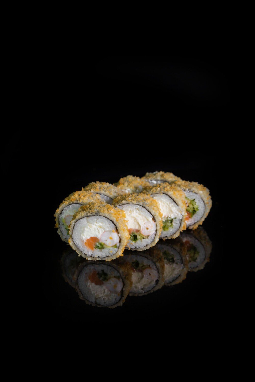 сыр сливочный, огурец, лосось, креветка, сухари панко, кляр