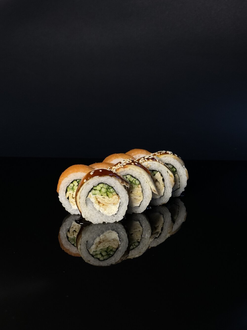 сыр сливочный, огурец, японский омлет, угорь,лосось, унаги соус, кунжут белый285 гр.