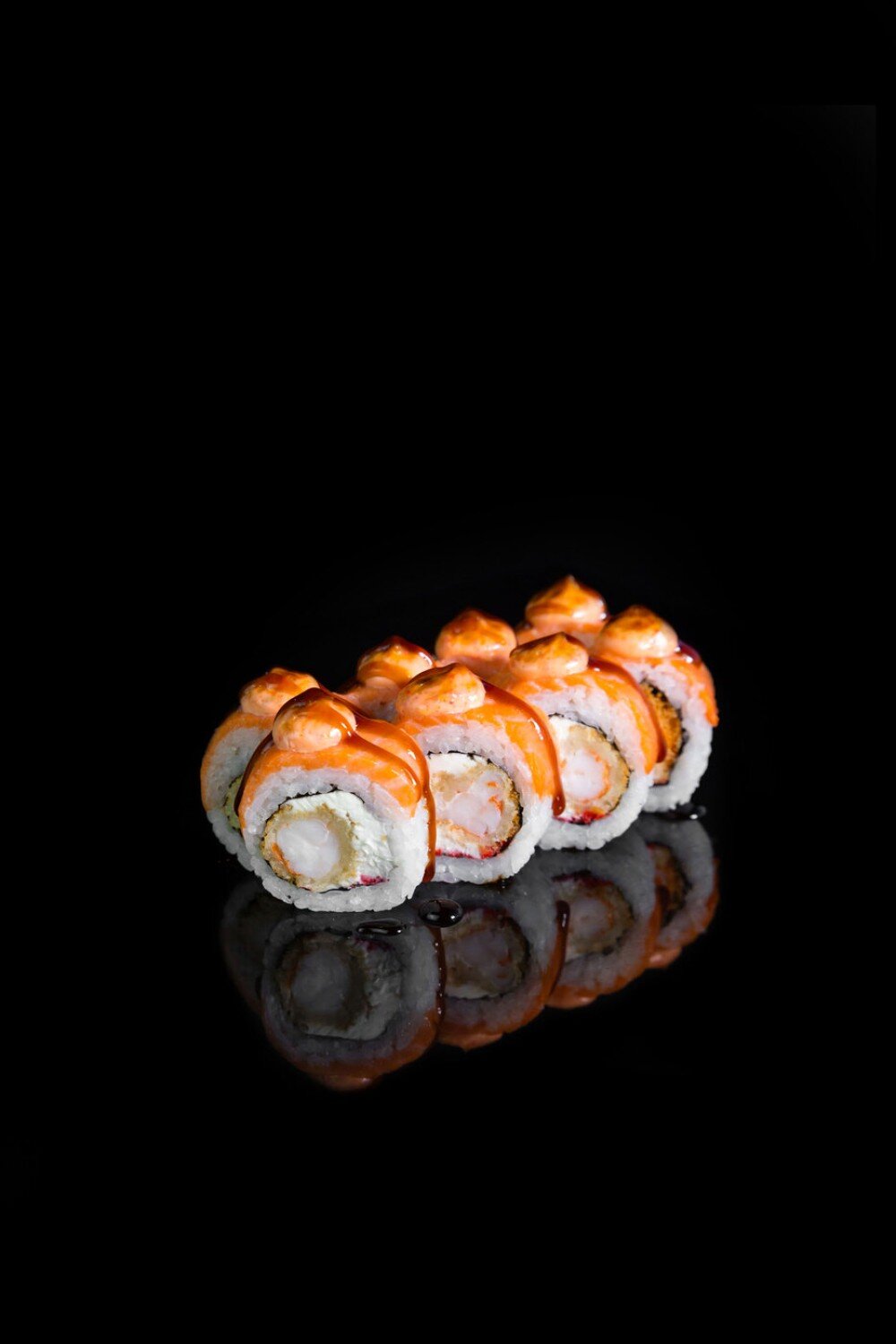 сыр сливочный, икра масаго, креветка темпура, лосось, спайси соус, унаги соус