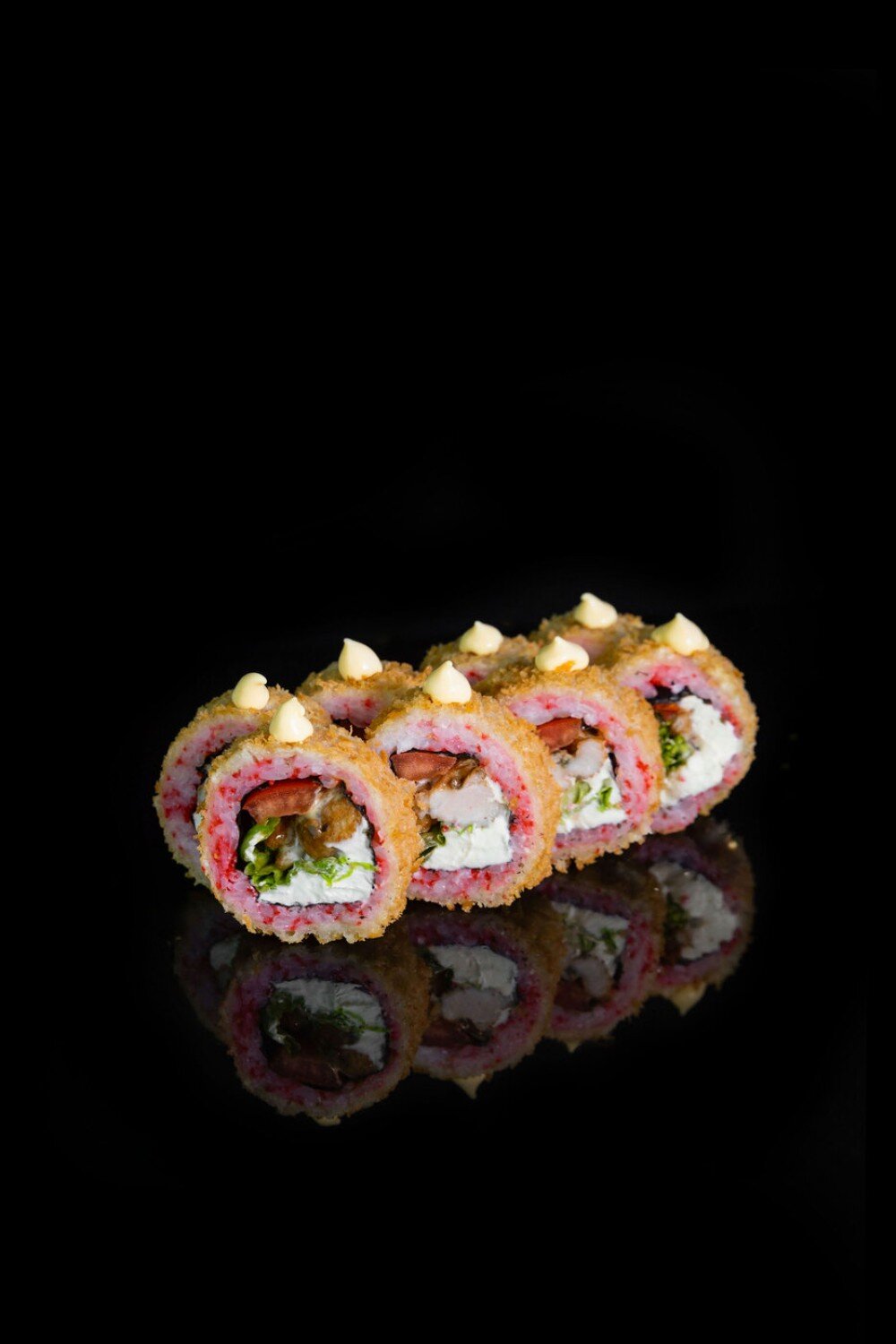 икра масаго, сыр сливочный, помидор, лист салата, курица по-пекински, соус сырный, сухари панко, кляр