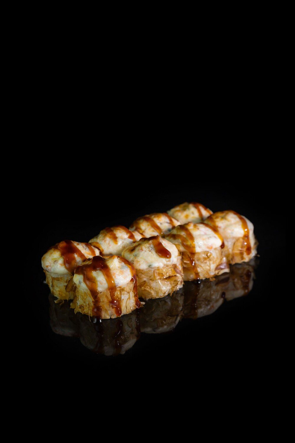 спайси соус, огурец, лист салата, японский омлет, стружка тунца, соус для запекания с лососем, унаги соус