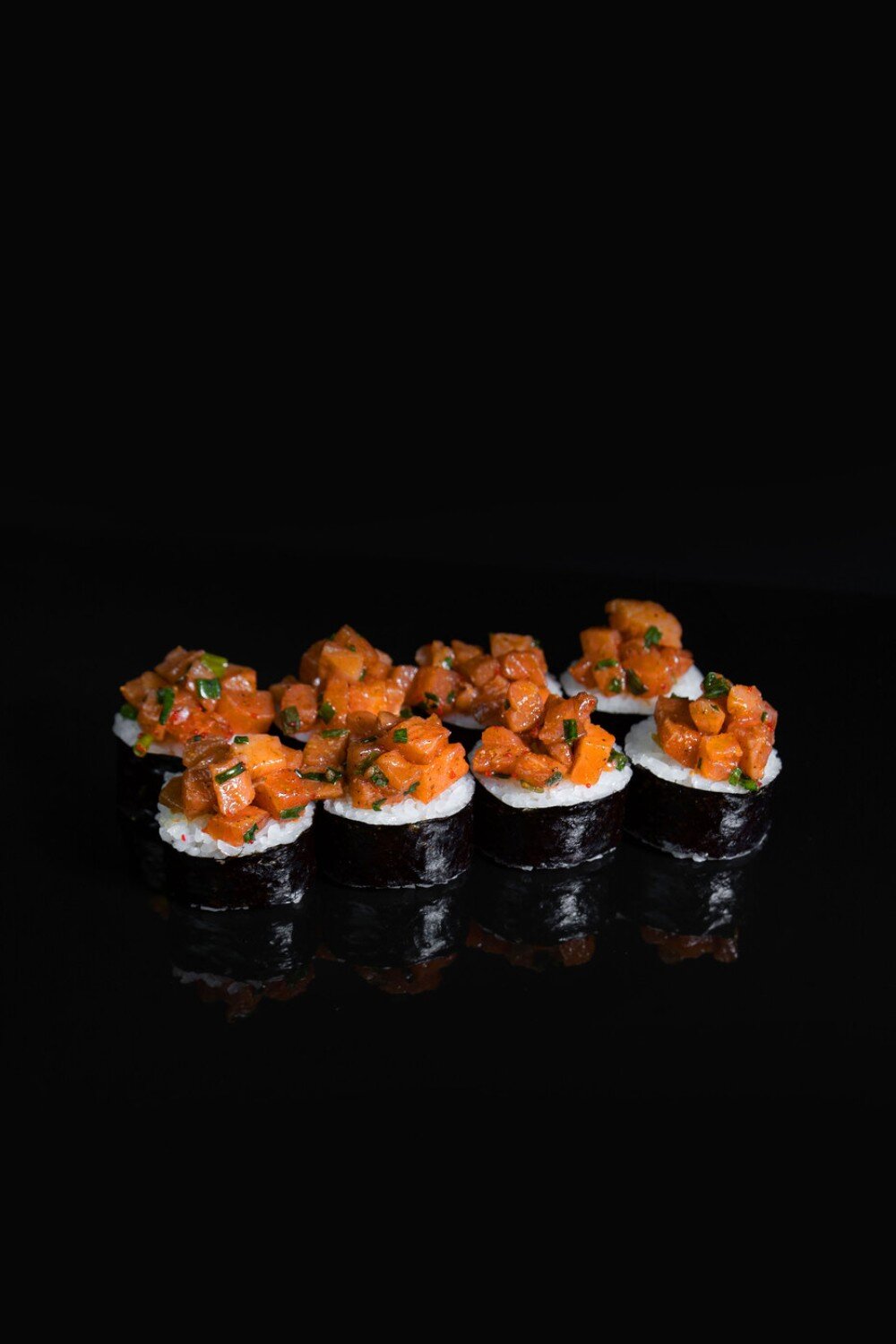 огурец, лист салата, японский омлет, тар-тар из креветки спайси, лук зеленый