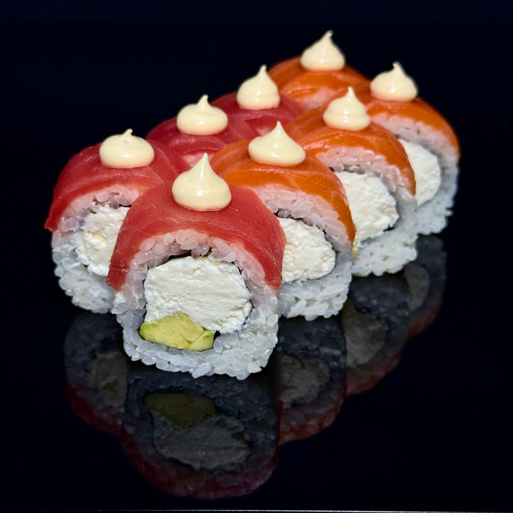 сыр сливочный, авокадо, лосось, тунец, соус свит чили, перья перья зеленого лука302 гр.
