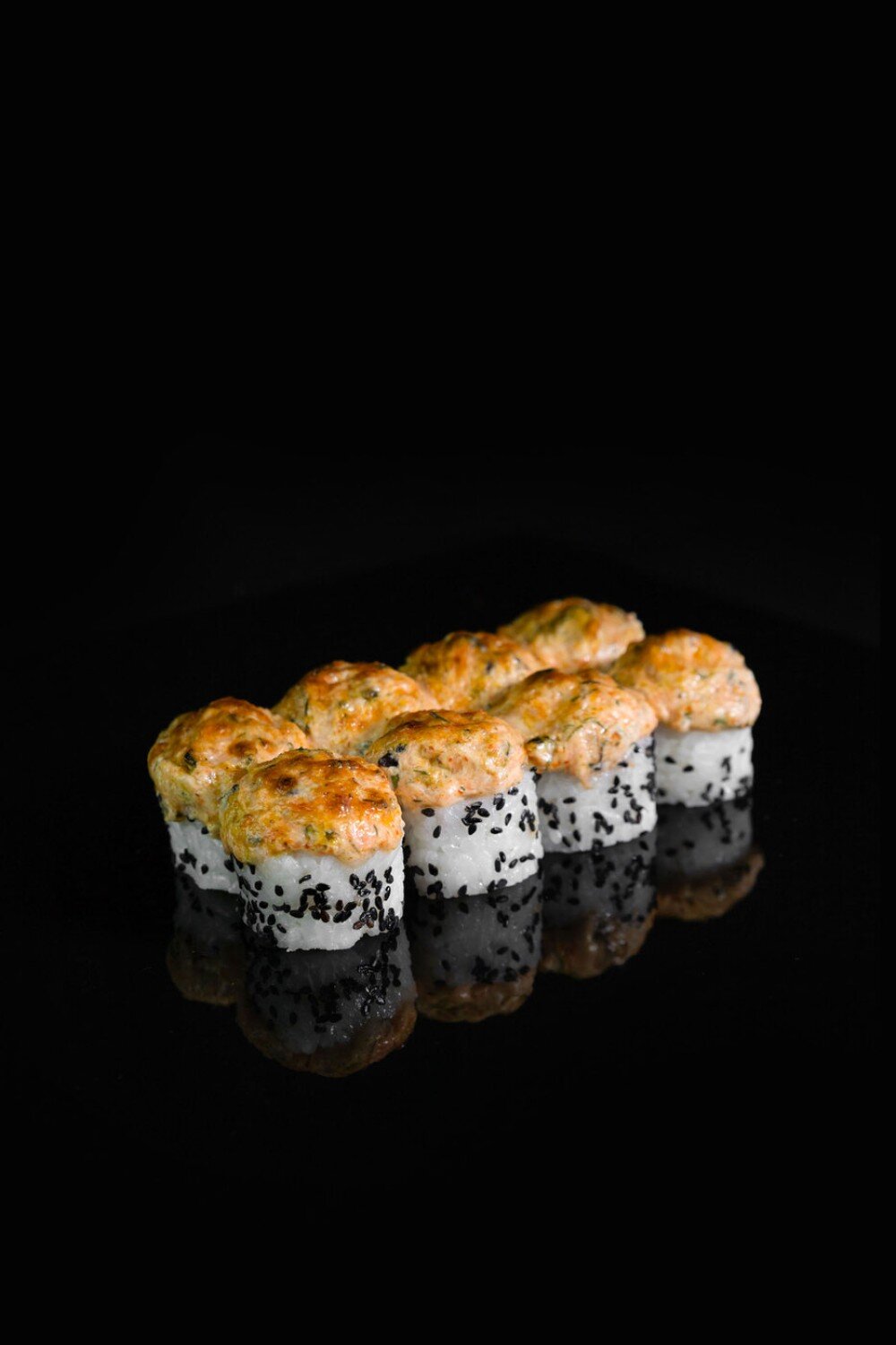 сыр сливочный, огурец, краб сурими, черный кунжут, соус для запекания с мидиями
