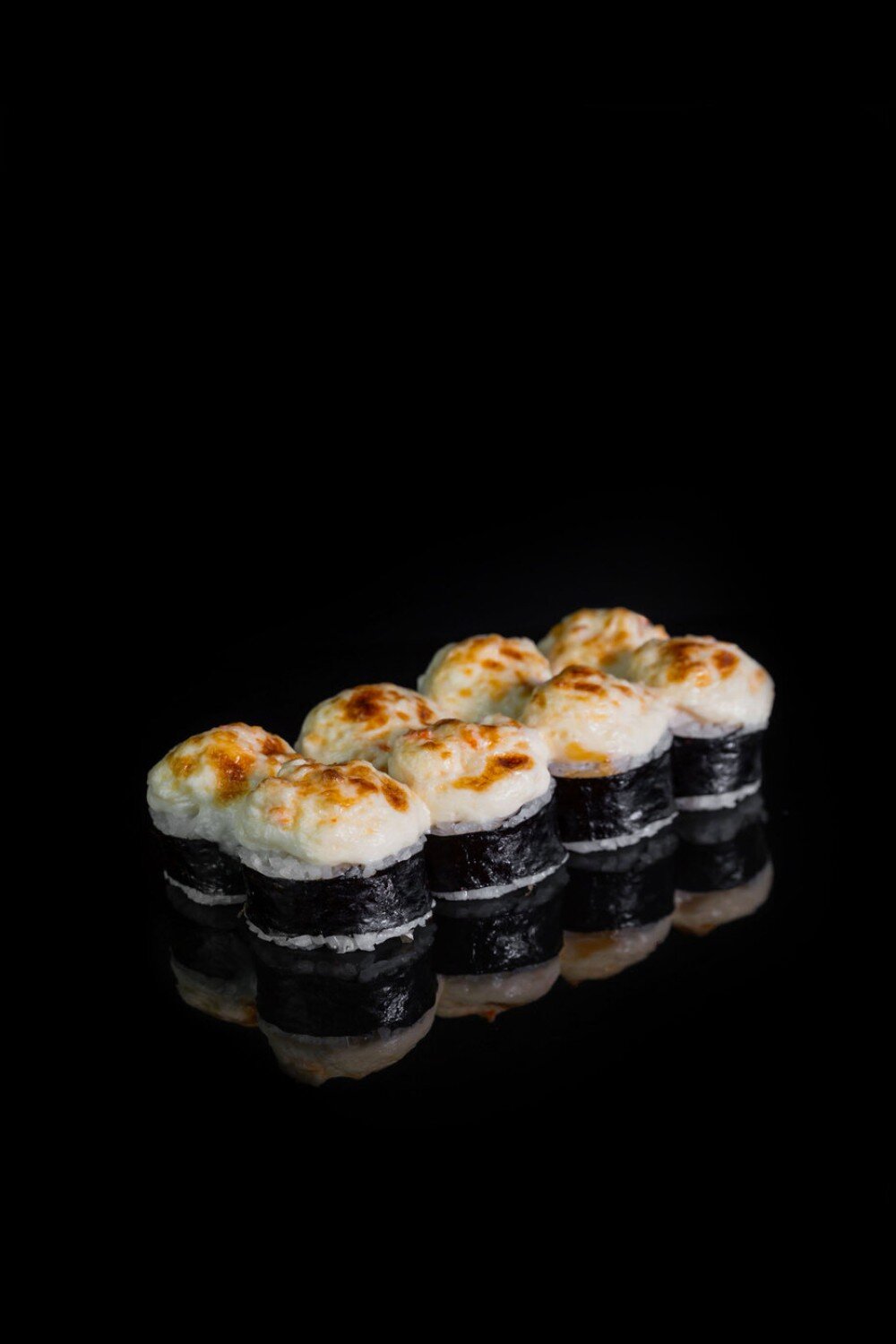 краб сурими, лист салата, маринованный дайкон, огурец, соус для запекания с креветкой