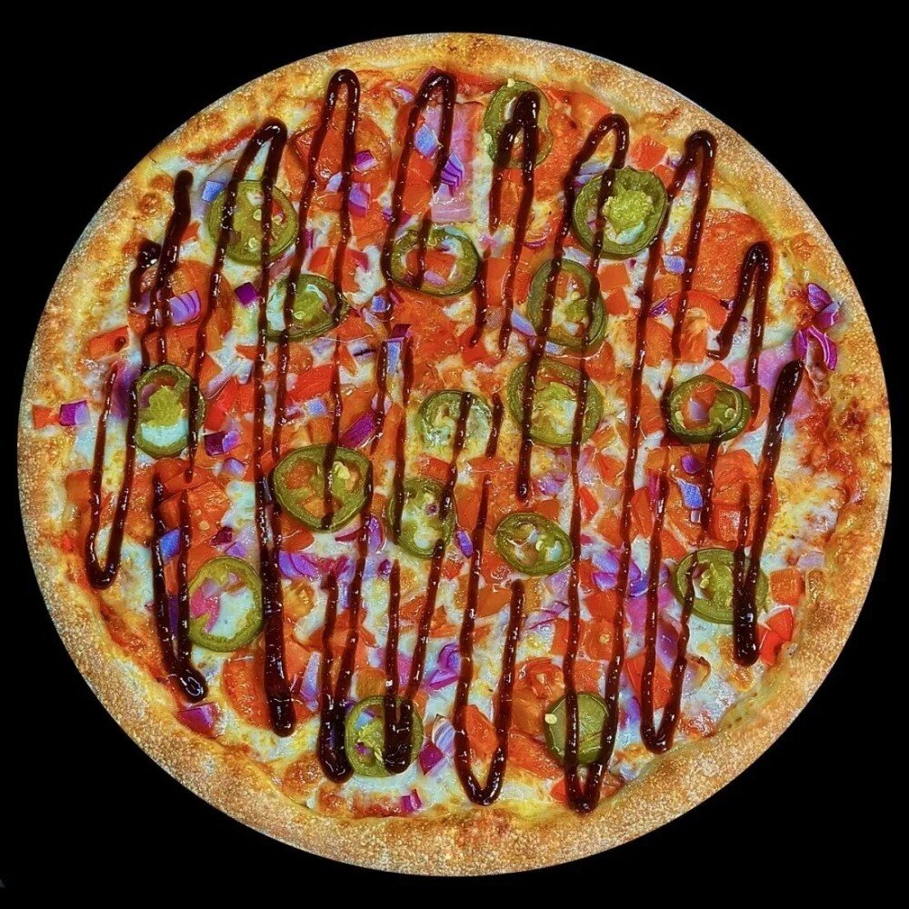 соус томатный, сыр моцарелла, пепперони, перец халапеньо, сладкий перец, красный лук, бекон, томаты конкассе, соус барбекю 710гр