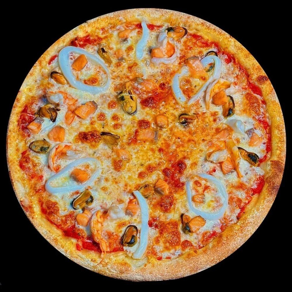 соус томатный, моцарелла, мидии, тигровая креветка, лосось, кальмар, 650 гр.