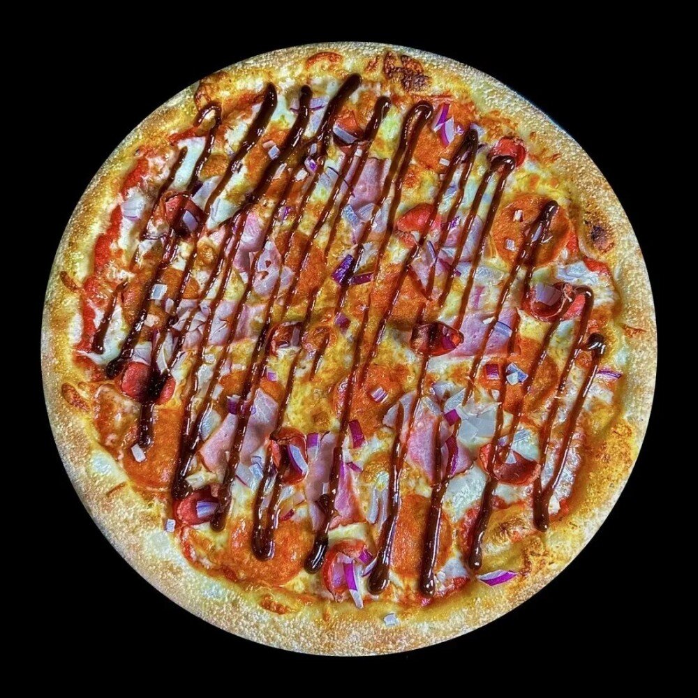 соус томатный, сыр моцарелла, пепперони, охотничьи колбаски, красный лук, бекон, соус барбекю645гр