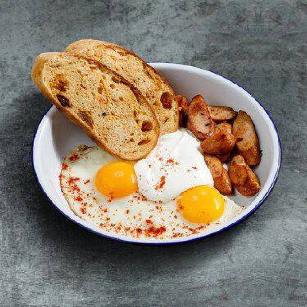 Глазунья из двух яиц с луковым джемом и гренками260г