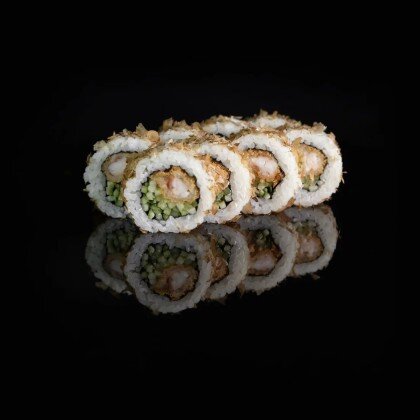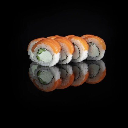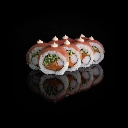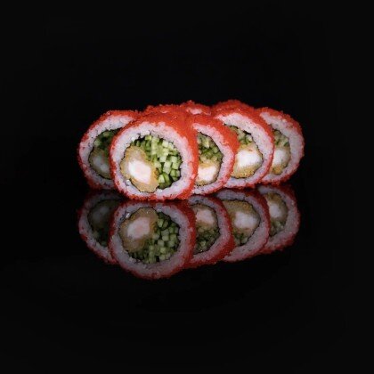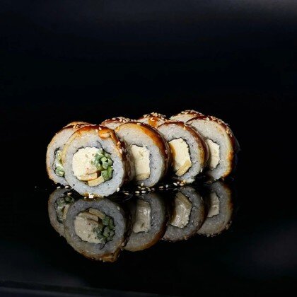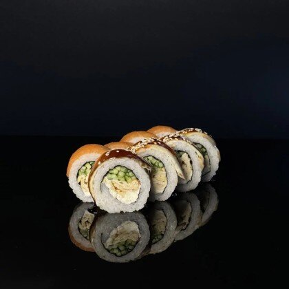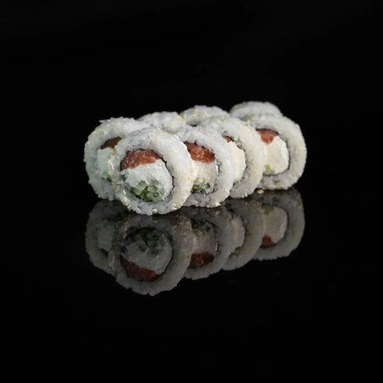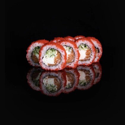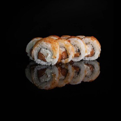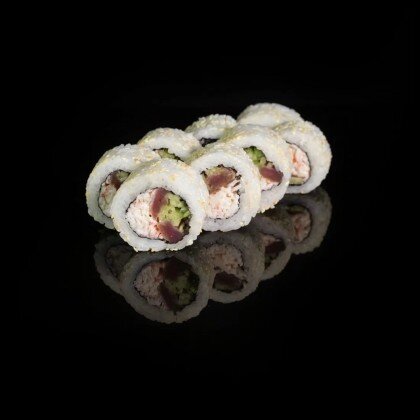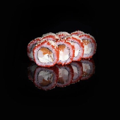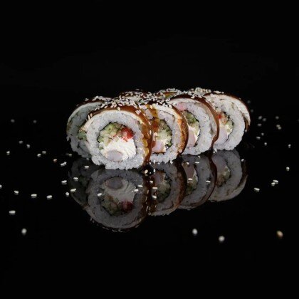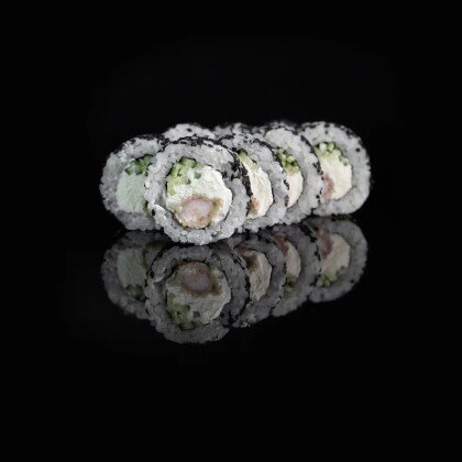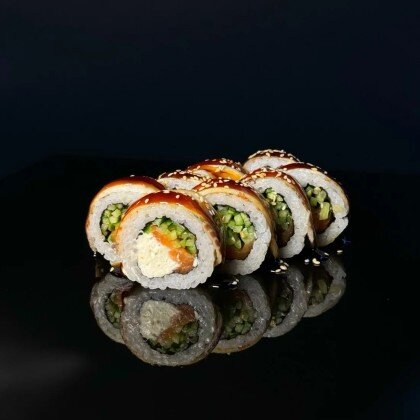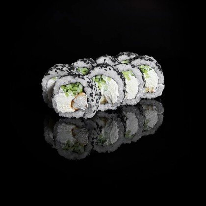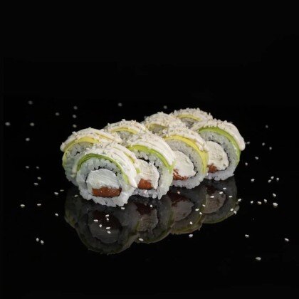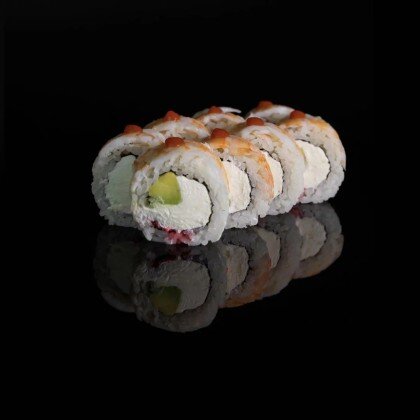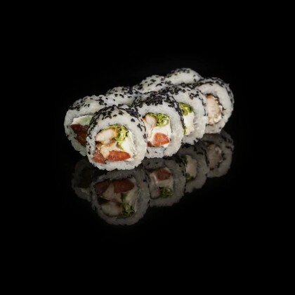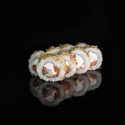 краб сурими, огурец, креветка темпура, сыр сливочный, лосось, авокадо, унаги соус, кунжут белый390 гр.