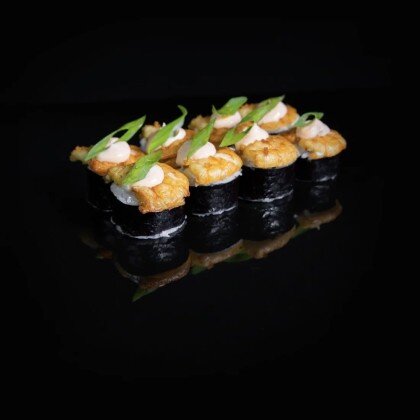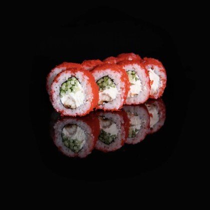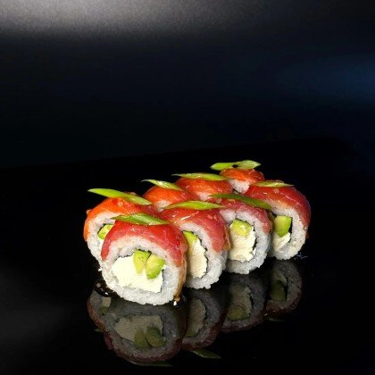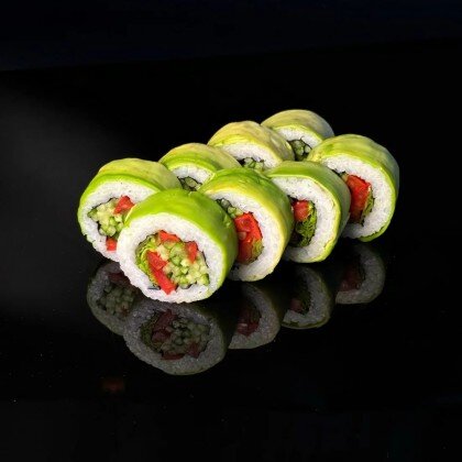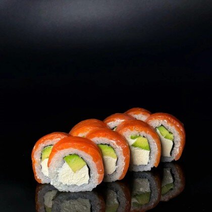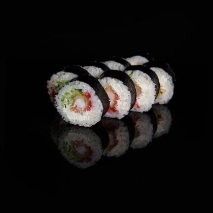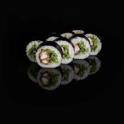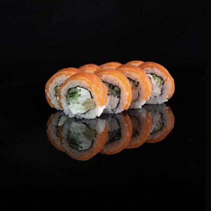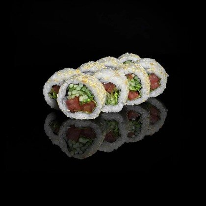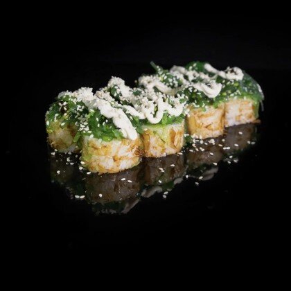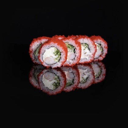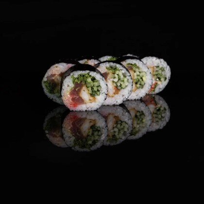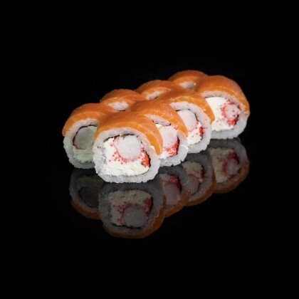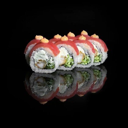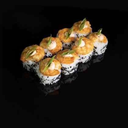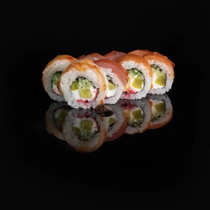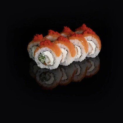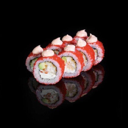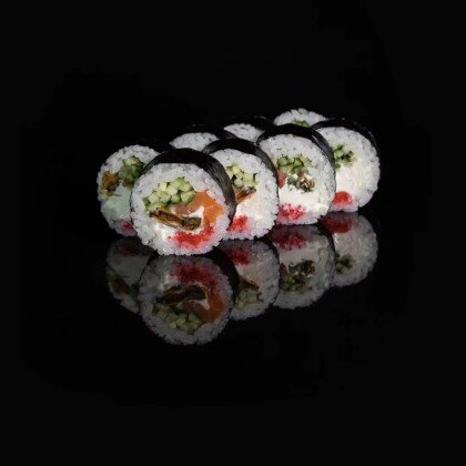 краб сурими, огурец, креветка темпура, сыр сливочный, лосось, авокадо, унаги соус, кунжут белый390 гр.