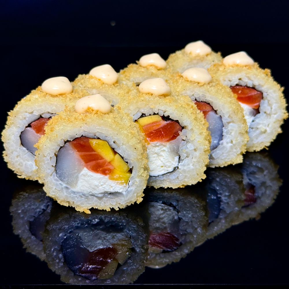 Рис, нори, сливочный сыр, манго, лосось, гребешок, манго соус