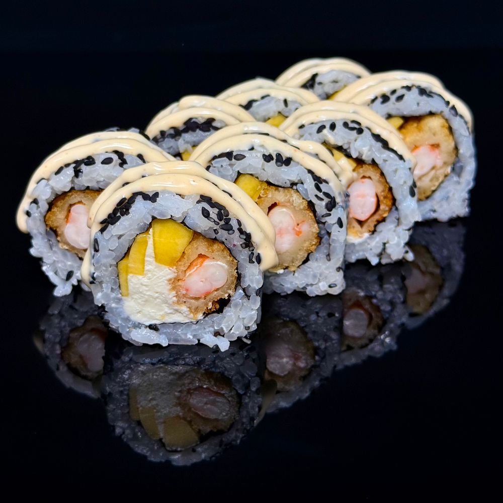 Рис, нори, сыр сливочный, креветка темпура, манго, манго соус.