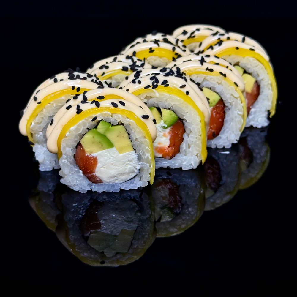 Рис, нори, сыр сливочный, авокадо, лосось, манго, манго соус.