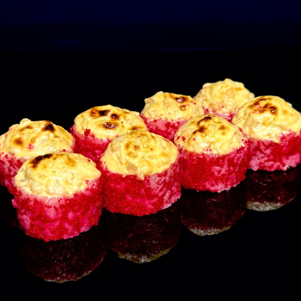 Рис, нори, сыр сливочный, креветка темпура, икра масаго, гребешок.